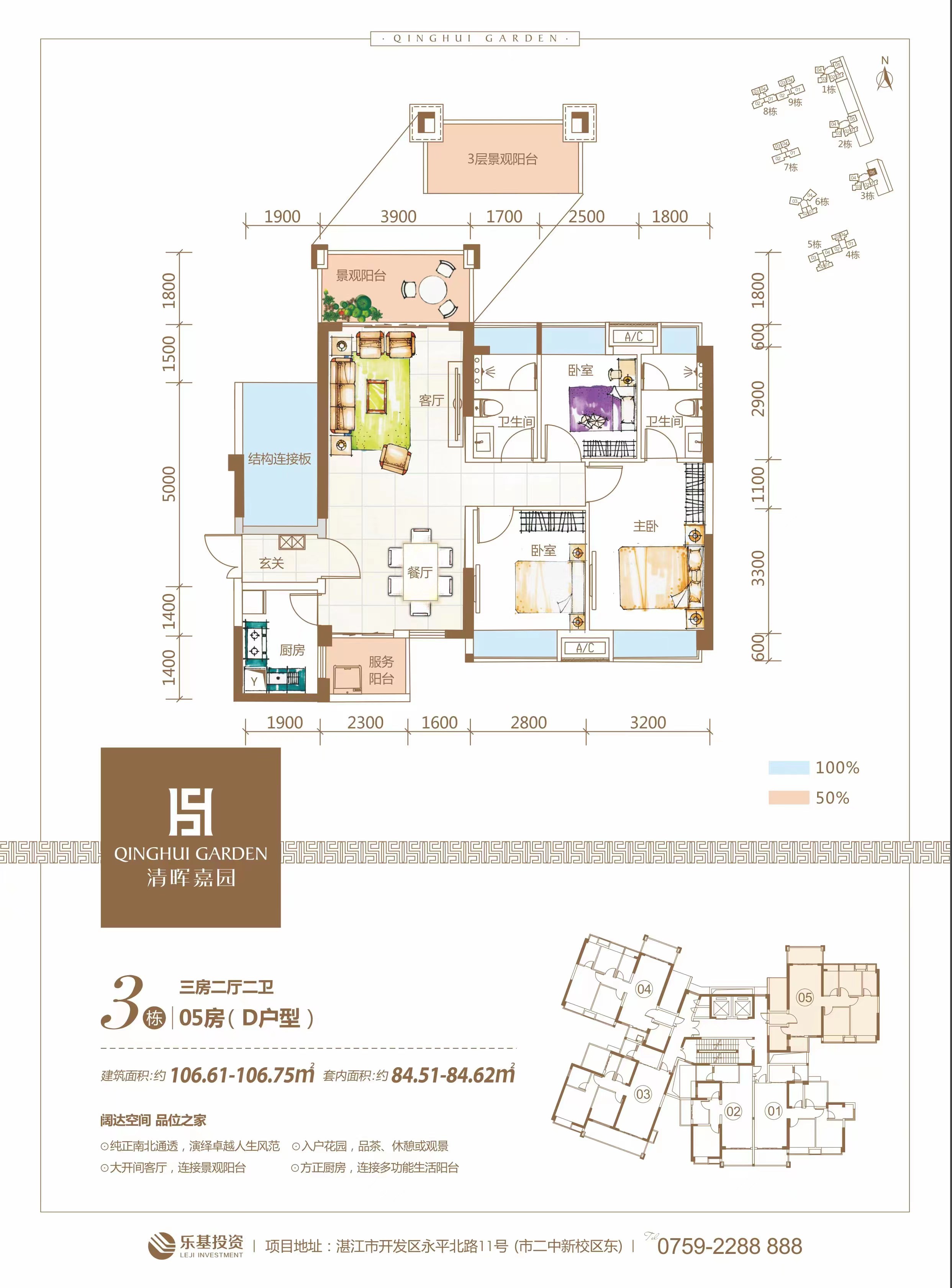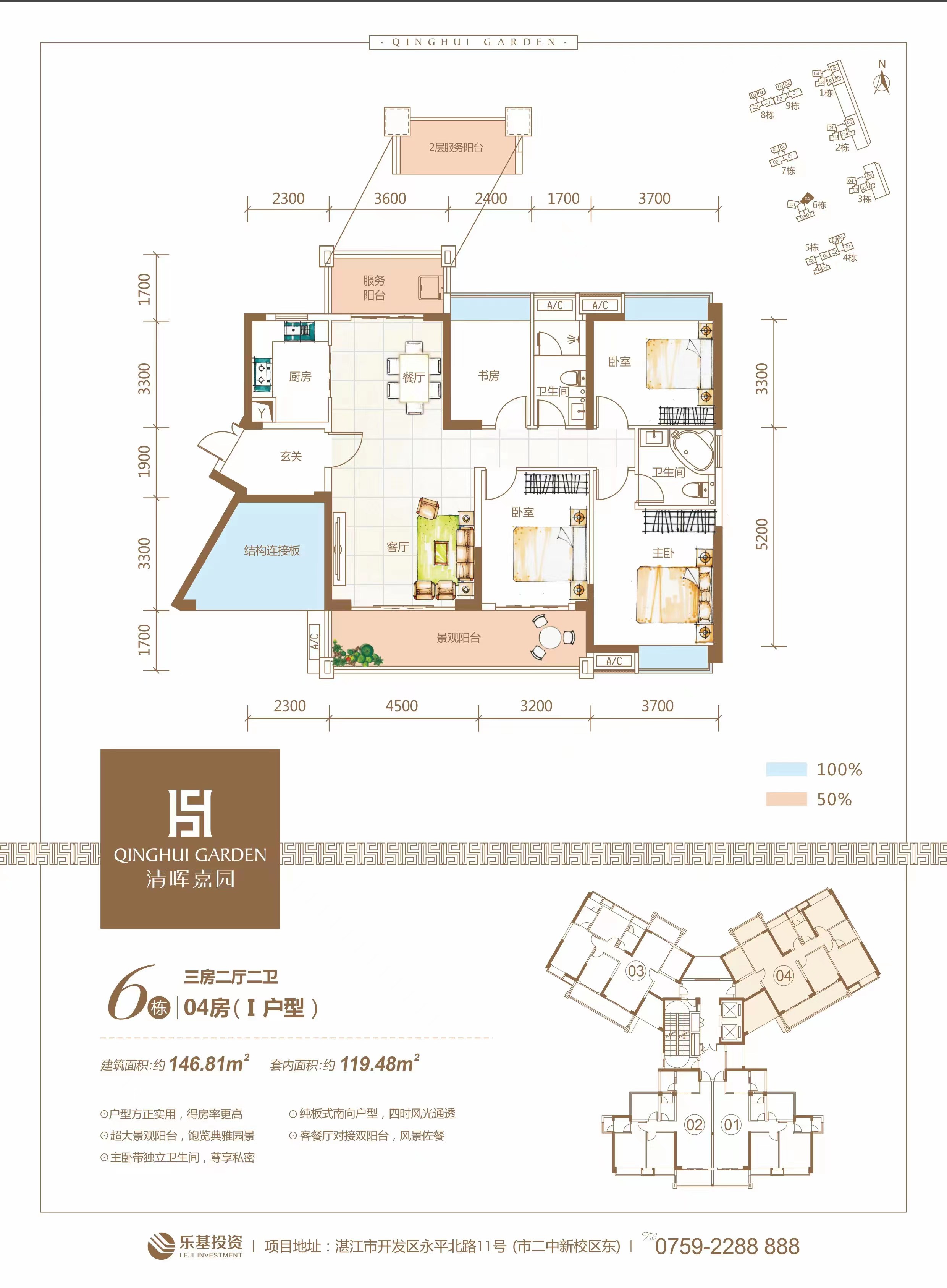 (1)区位优势:清晖嘉园位于市二中新校区东面,坐落在海湾大桥西的永平北路与龙汐路交汇处,湛江中心板块—乐山板块(湛江“珠江新城”)辐射湛江全城,不折不扣的城市都会,商务中心,出行方便,直抵全城。 (2)教育配套优势:在清晖嘉园的步行范围之内,美德堡幼儿园、开发区四小、开发区四中、湛江市二中汇聚在此,从幼儿园到高中的教育配套一应俱全 (3)精致园林优势:传承了广东四大名园清晖园精髓,以清晖意境为底蕴的中式园林,二十四景观赏, 中式岭南园林。打造“一环、两脉、三进、八园、二十四景”的景观格局,叠山、里水、道路铺装、绿化等,以国学文化为底蕴的新中式景观园林(中国清晖园(广东四大名园之一)之精髓) (4)项目品质优势:9栋建筑南北排列,户户南北向,舒适宜人;六米的挑高大堂,通风采光的设计,干挂石材,蒂森克虏伯品牌电梯,质感分明,细节考究。78-148的三房到五房,高拓展户型(使用率基本达到90%以上),户型方正;视野开阔,超高层可观海天一色,中低层享小区园景。 (5)硬件优势:节能住宅,(采用环保材料的保温层,双层中空保温隔音钢化玻璃),世界名牌德国蒂森克虏伯电梯,彩色可对讲智能化门视系统;酒店式入户大堂。 (6)泛会所优势:利用6米挑高的架空层,在4-6号楼设置了动态主题会所“欢聚时光”, 6米的架空层设计:状元堂、读云轩、笔生花馆、碧溪草堂、留芬阁、竹苑六大文化体验区,每个体验区都有一个主题,打造集茶道、音乐、棋艺、书法、绘画、阅读于一体的“清晖雅集”泛会所。 (7)贴心物管:自建志基物业,专门针对清晖嘉园,打造亲情式贴心物管,志基物业贯彻“用心服务,一生呵护”的理念,通过亲情式服务,酒店式管家,总经理信箱、接待日等方式,结合尖端智能化安防系统,24小时实时监控,对业主生活关照无微不至,让业主时刻感受高尚人文生活。