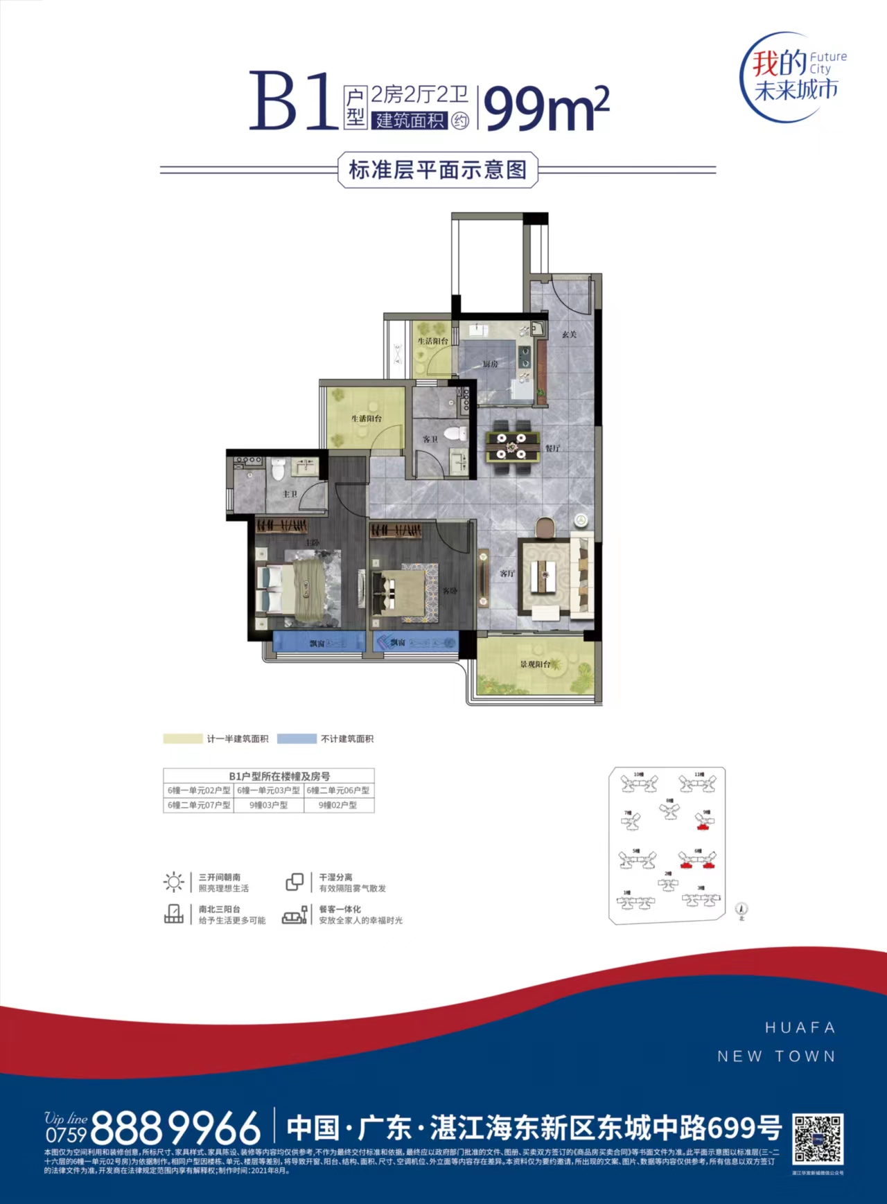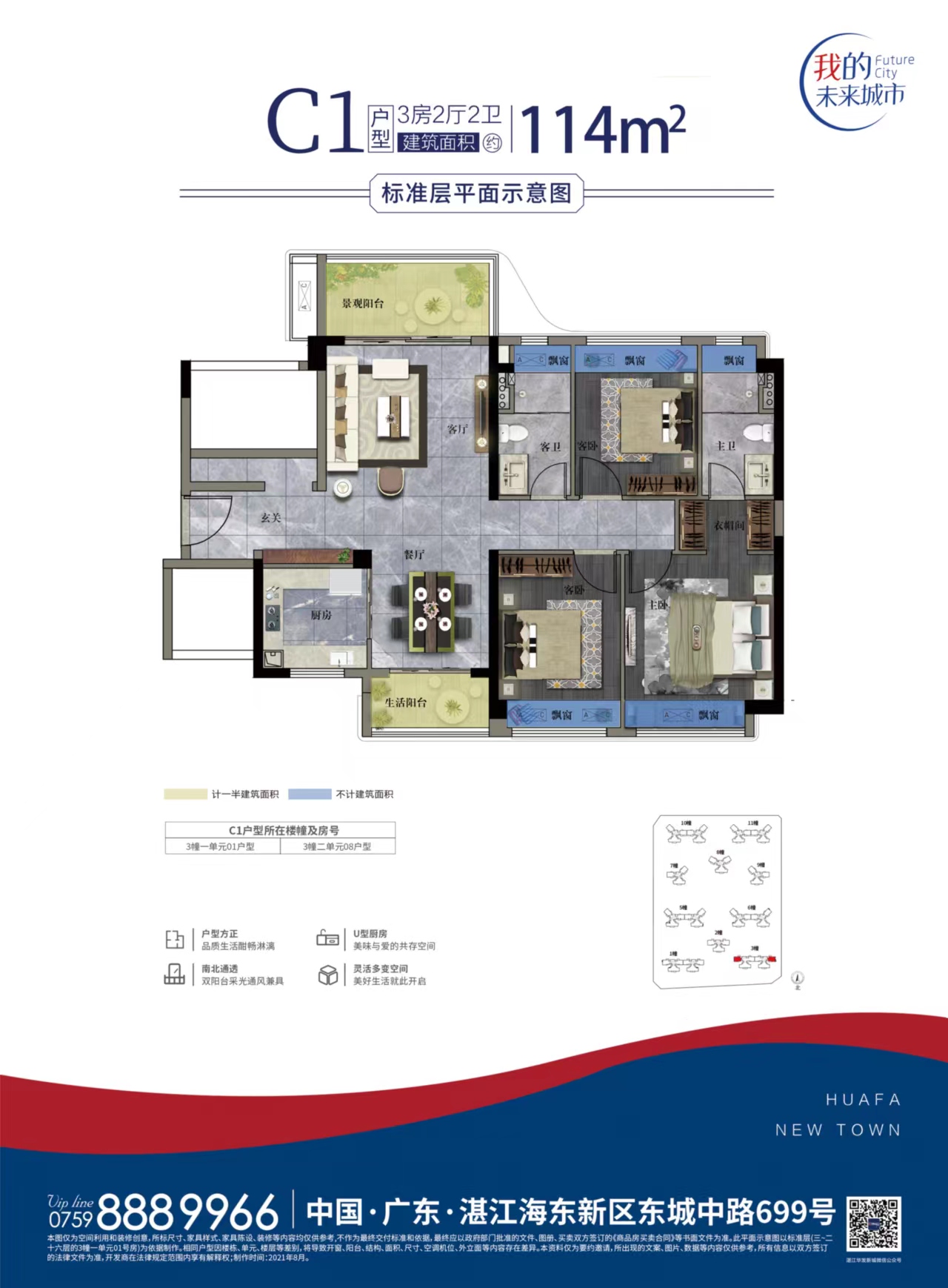 3+1户型, 阳台朝南。